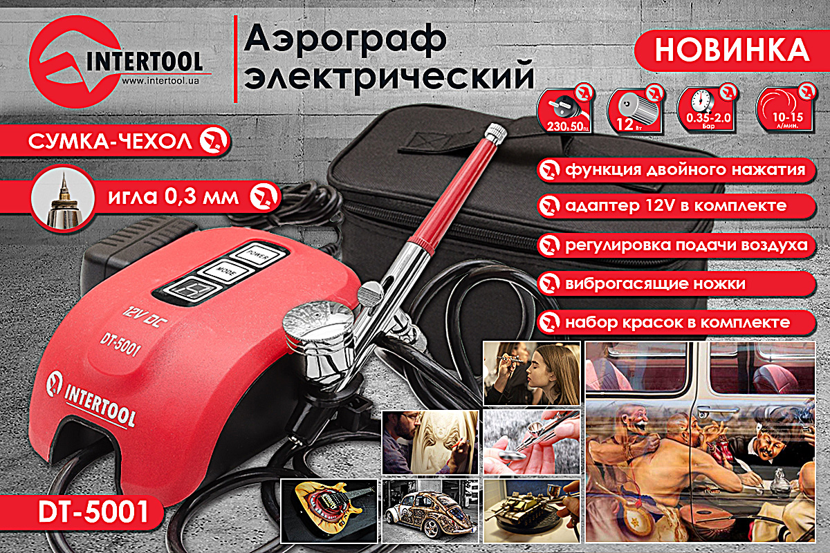 Використовується художниками, ілюстраторами або ретушерами для малювання складних малюнків, візерунків, дрібної розпису і т. д. Купити аерограф DT-5001 можна і для професійного нанесення макіяжу, дизайну нігтів або декорації тортів. Діаметр форсунки аерографа 0,3 мм, діапазон робочого тиску від 0 до 2 бар. Споживана потужність 12 Вт. Прилад комплектується адаптером 12 В.