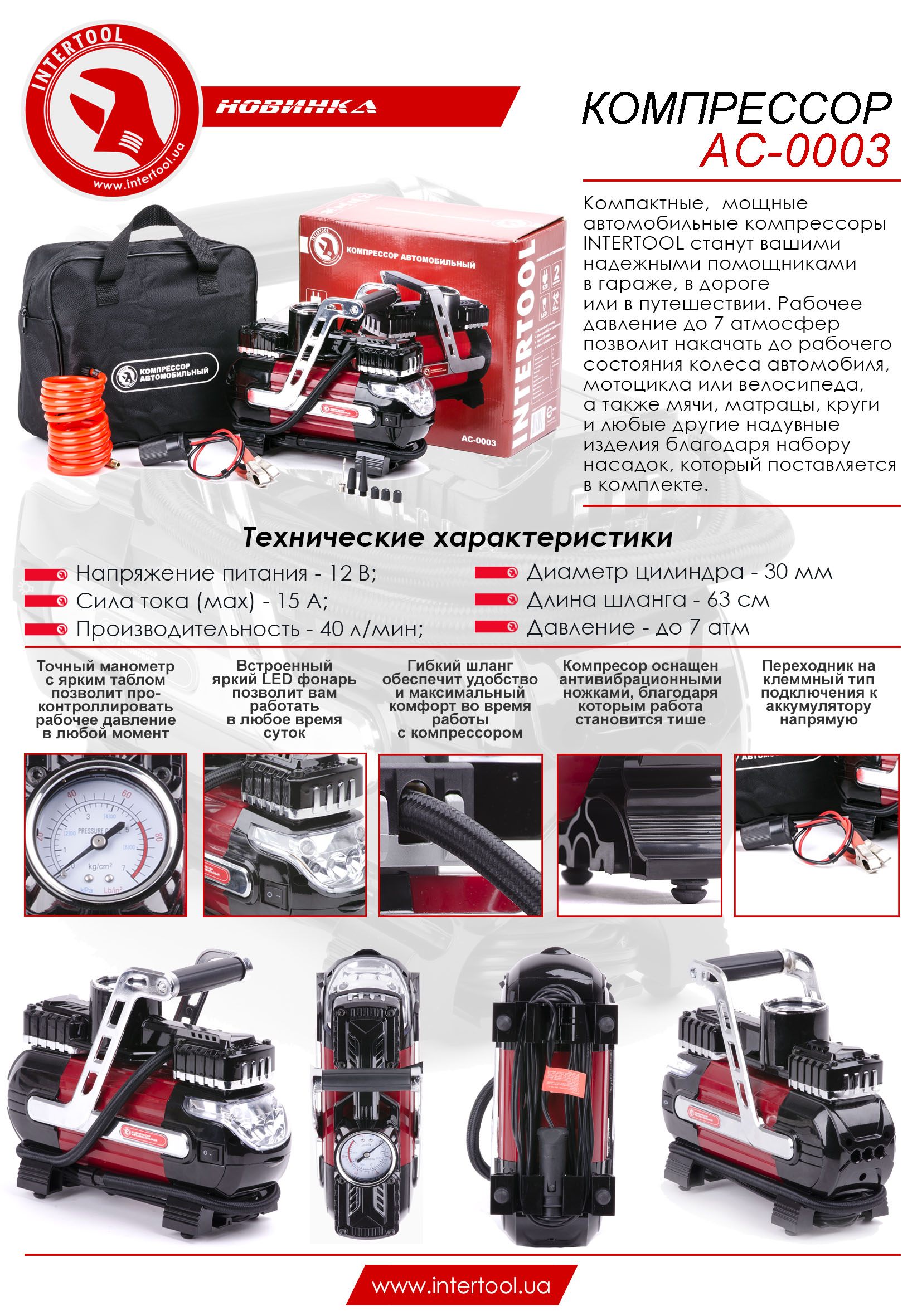 Компресор має дуже скромні габарити, тому разом із комплектом та сумкою поміститися навіть у невеликих багажниках. Живлення здійснюється від прикурювача автомобіля 12В, тому ви зможете легко накачати колесо в дорозі. Довжина мережевого дроту 3 метри.